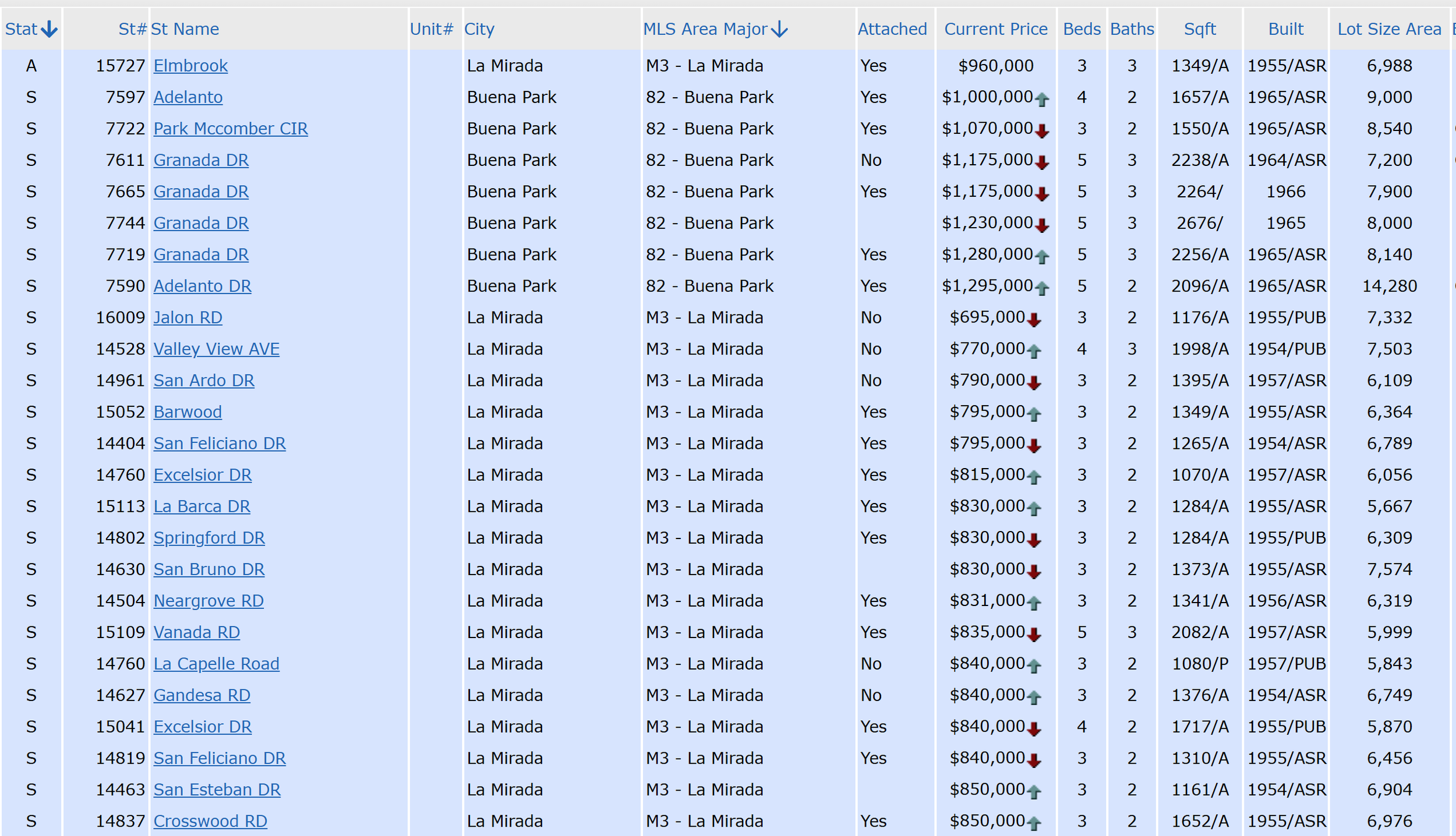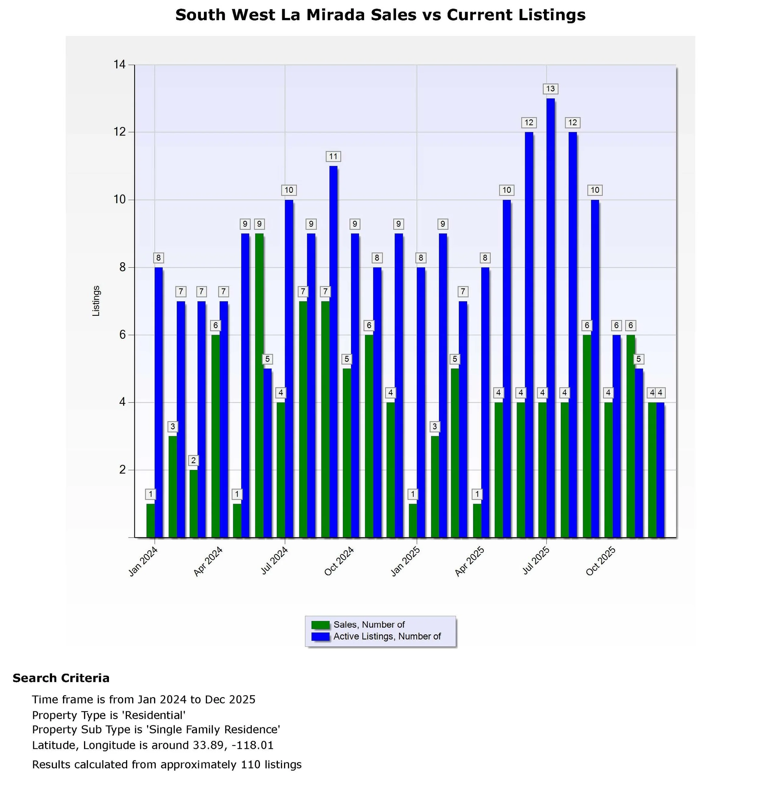 The 12-month average price for this neighborhood was $894,000, compared with $865,000 for the previous 12 months. This gives the South West La Mirada area an average monthly price increase of $29,000 over the last 12 months. As you can see from the price graph, prices in the South West La Mirada area have remained relatively stable over the previous 12 months. The lowest monthly average for the last 12 months was $817,000, and the highest was $974,000. This gives us a price spread of $157,000 for the neighborhood in the previous 12 months. The price difference will be due to factors such as property condition, added square footage, an added pool, and location.