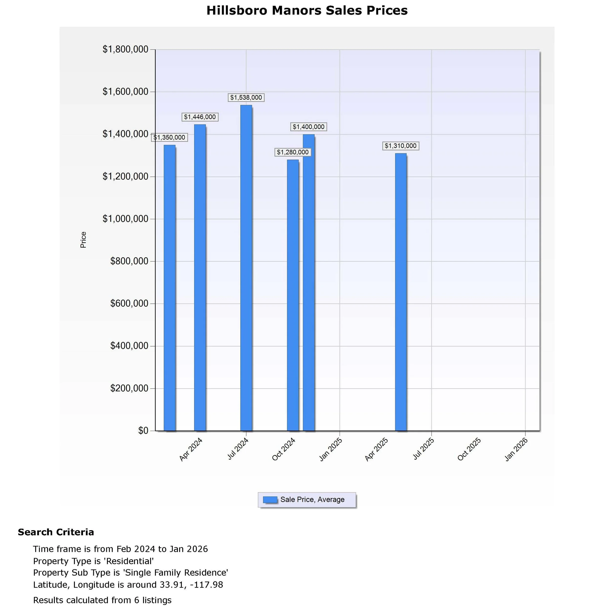 Over The last 12 months, the average price for this neighborhood was $1,310,000, compared to $1,403,000 in the previous 12 months. This results in an average monthly price decrease of $93,000 for the Hillsboro Manors neighborhood over the last 12 months. As you can see from the graph below, prices in the Hillsboro Manors neighborhood have remained relatively stable over the last 12 months. The lowest monthly average for the last 12 months was $1,310,000, and the highest was $1,310,000. This yields a price spread of $0 for the neighborhood over the last 12 months because of low sales. Normally, there would be a price difference due to factors such as property condition, added square footage, an added pool, and location.