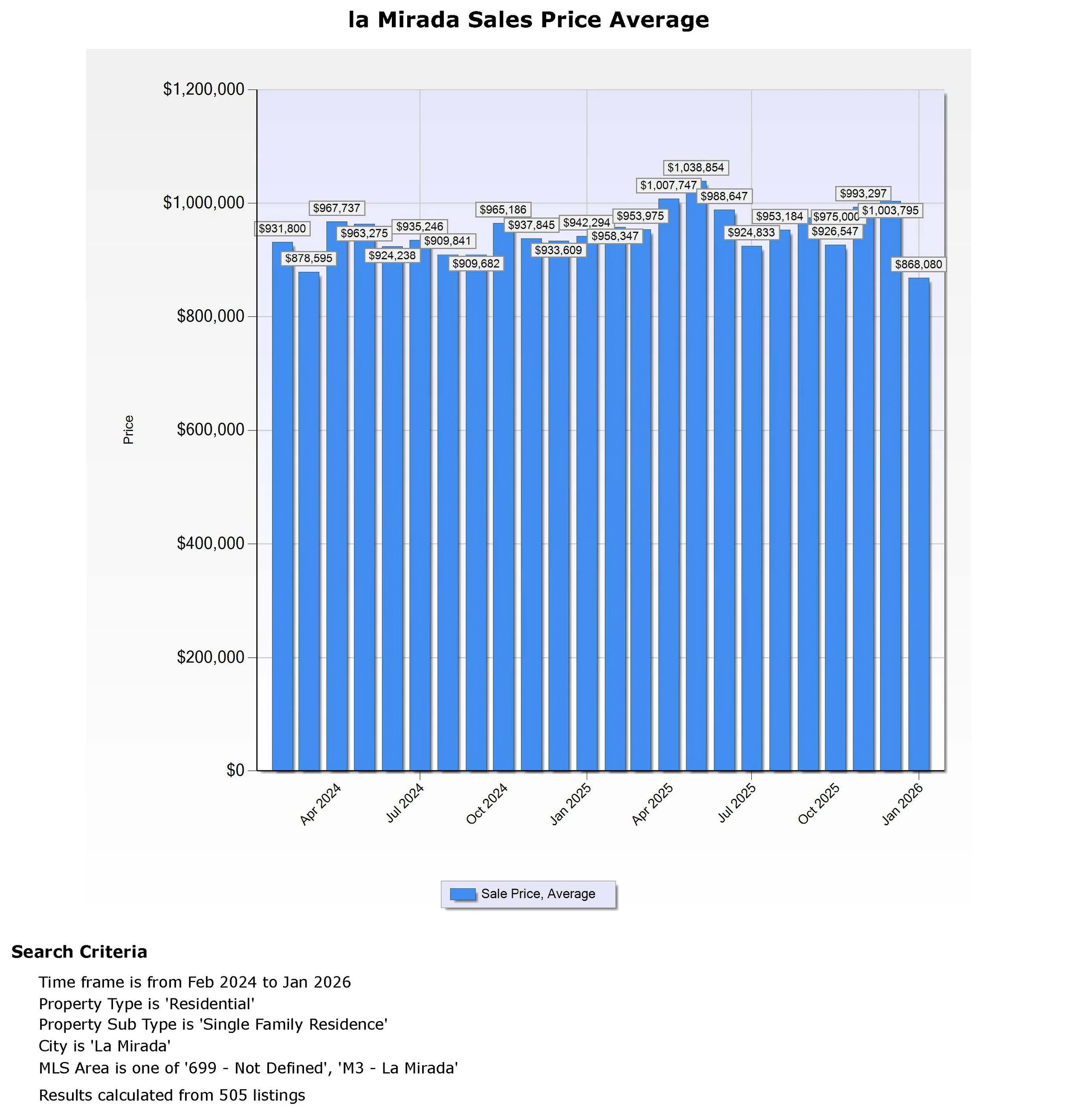 Over The Last 12-months the average price for La Mirada was $966,000, compared to $933,000 for the previous 12 months. This yields an average monthly price increase of $33,000 in the City of La Mirada over the last 12 months. As you can see from the graph below, prices in La Mirada have remained relatively stable over the last 12 months. The lowest monthly average for the last 12 months was $868,000, and the highest was $1,039,000. This yields a price spread of $171,000 for La Mirada over the previous 12 months. The price difference will be due to factors such as property condition, added square footage, an added pool, and location.