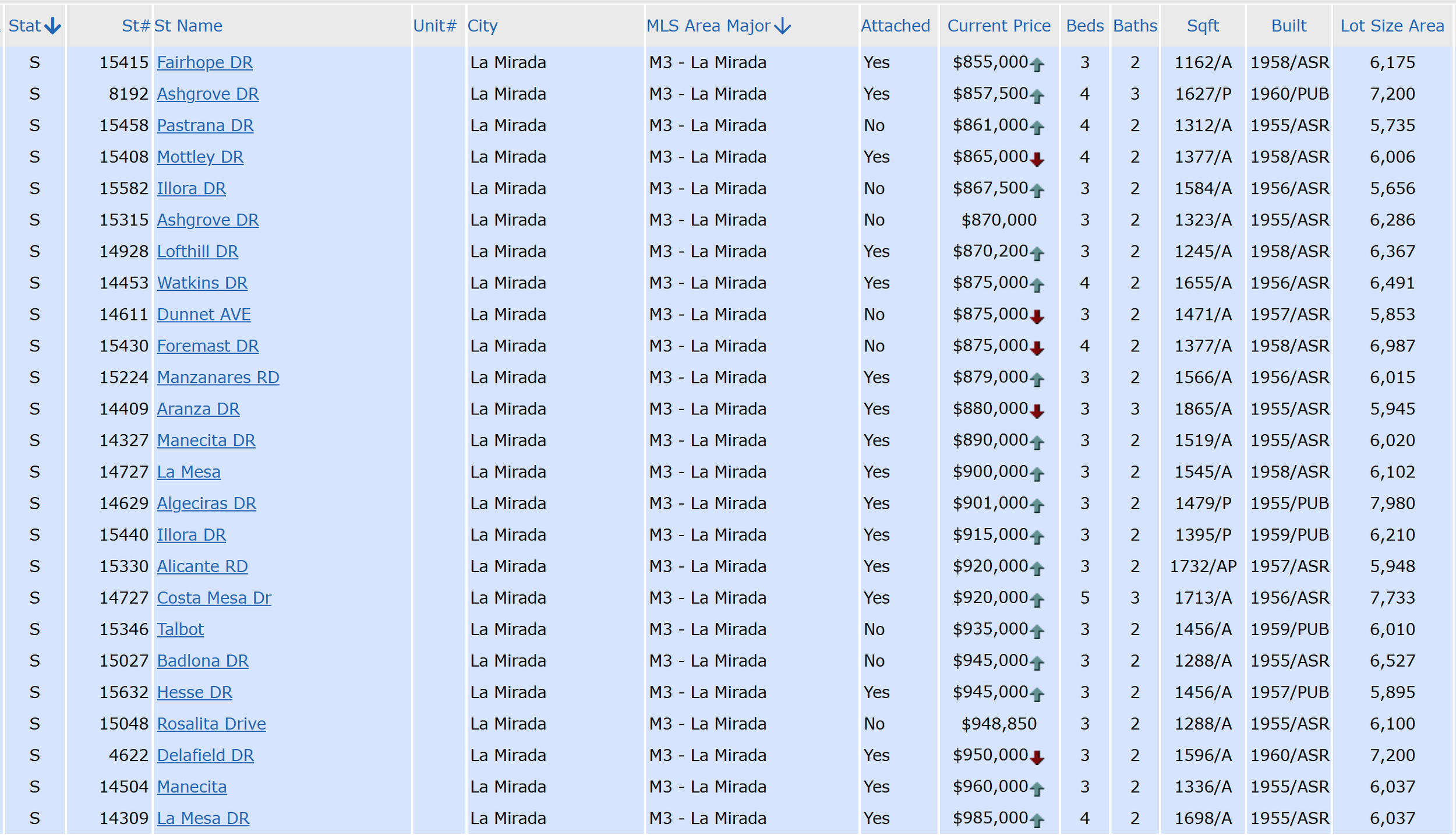 The tables below lists the prices used in the South East La Mirada’s neighborhood analysis for the last 6 and 12 months