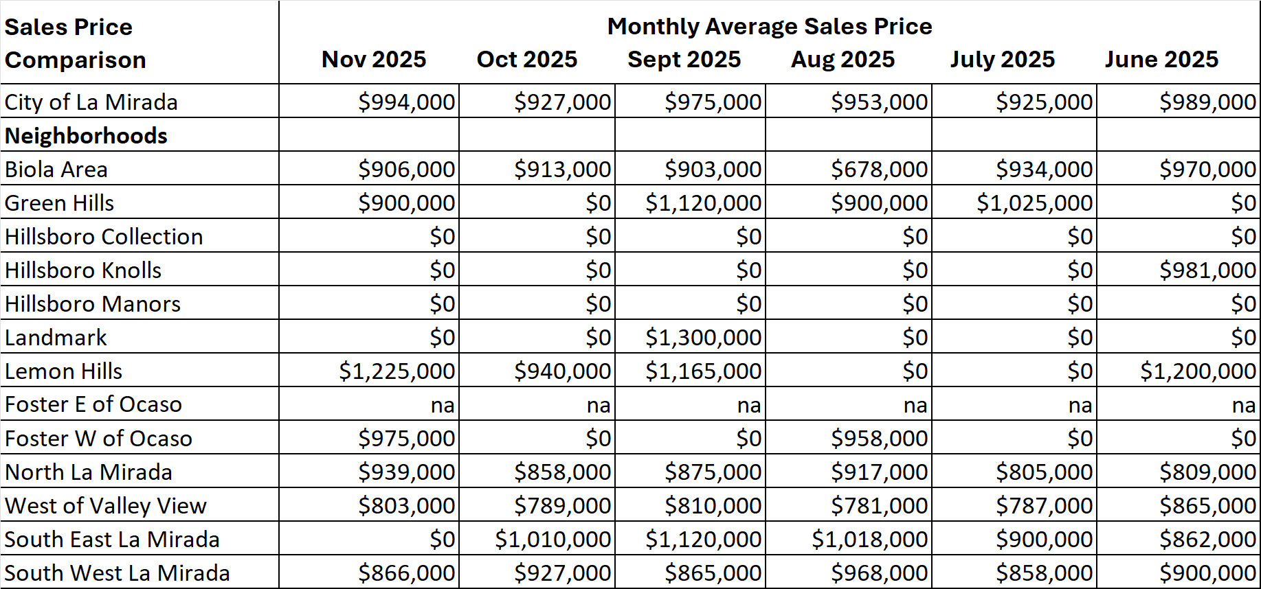 If you would like to see how the North of Foster Rd, West of Ocaso prices compare to the city of La Mirada and the other neighborhoods, you can see this at the conclusion of this report titled: North of Foster Rd, West of Ocaso comparison to the city of La Mirada and other La Mirada neighborhoods